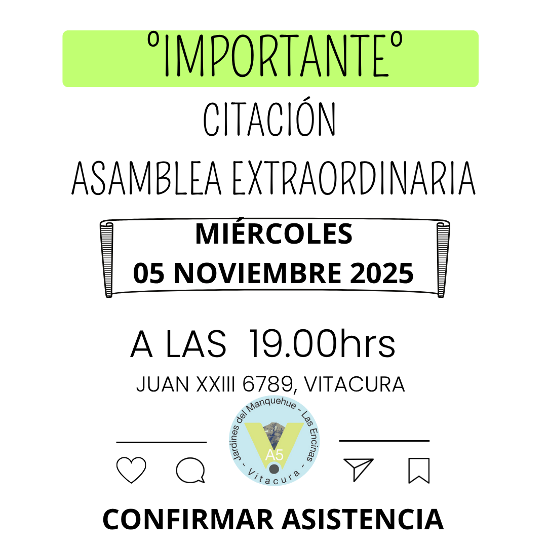 A través de la presente, los citamos a asamblea extraordinaria que se llevará a cabo el día miércoles 5 de noviembre 2025 a las 19.00hrs, en nuestra sede ubicada en Juan XXIII 6789, Vitacura.