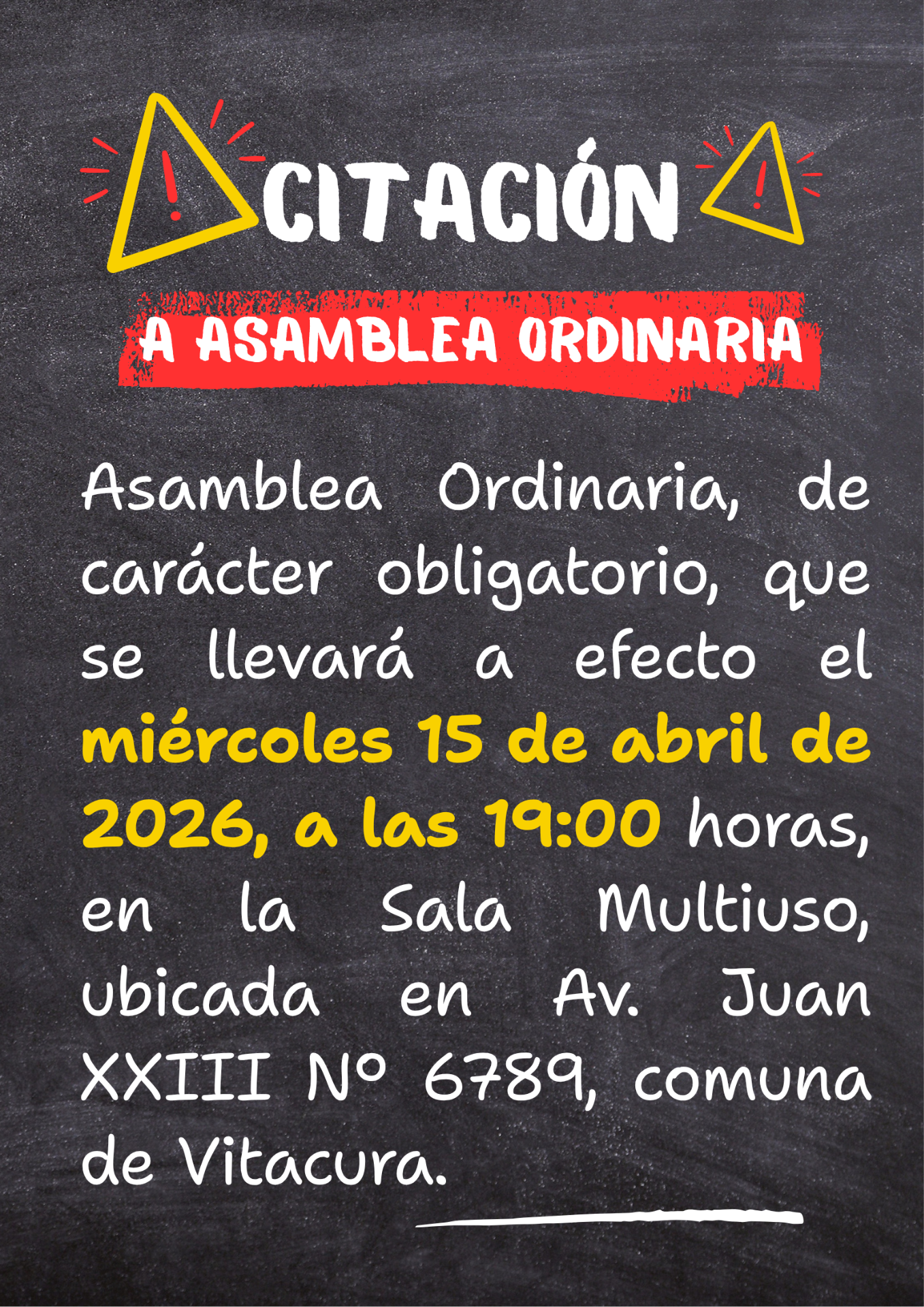 De conformidad con lo dispuesto en la Ley N° 19.418 sobre Juntas de Vecinos y demás Organizaciones Comunitarias, en particular en su artículo 10, letra E, se cita a todos los socios y socias de la Junta de Vecinos A5 "Jardines del Manquehue – Las Encinas" a participar en la Asamblea Ordinaria, de carácter obligatorio, que se llevará a efecto el miércoles 15 de abril de 2026, a las 19:00 horas, en la Sala Multiuso, ubicada en Av. Juan XXIII N° 6789, comuna de Vitacura.